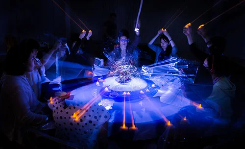 Carrying flags of symbolic surrender, participants set out on a downriver procession, harmonizing with a fire and water-themed chant they learned just prior to departure. Arriving at a station at the waterfront's end, they painted marks on the surface of the station tables in the colors of fire, acknowledging their personal experiences of loss and surrender. In a pivotal moment, participants then used their white flags to erase those marks, transforming the flags of surrender into symbols of fiery resilience.