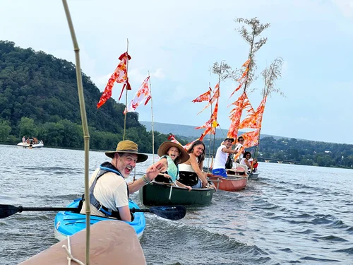 The culminating ceremony took place along Sunbury’s Riverfront park on September 9th. In the late afternoon sun, a tiny but mighty regatta arrived, festooned with white silk flags to deliver to those gathered along the shore. (Using silk flags as the project’s central element is a tribute to the region’s history as a home to industrial silk mills.)